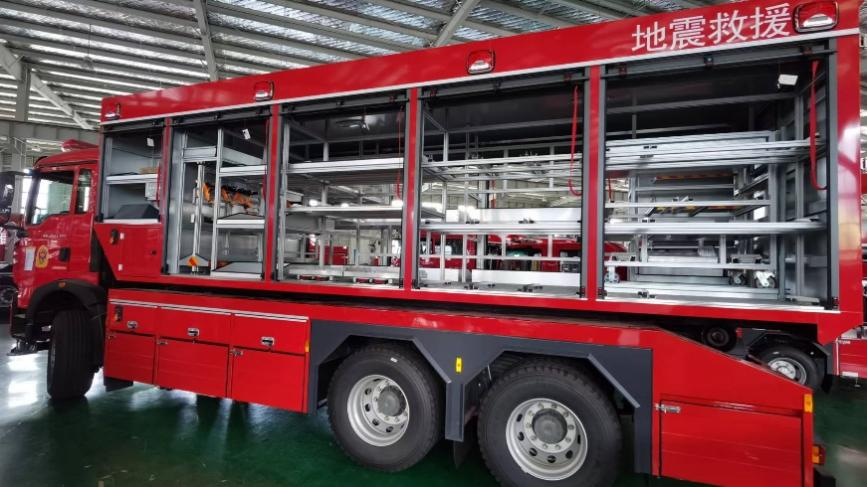 3.3 | 儲物箱:車輛設(shè)有防水、防塵的鋁合金卷簾門,卷簾門觸發(fā)電磁傳感器自動開關(guān)LED照明;在兩側(cè)卷簾門下方設(shè)有翻轉(zhuǎn)腳踏板,踏板行程由氣彈簧控制,踏板由整塊特制高強度鋁型材裁剪并與附件無焊接組裝而成、站立面防滑,每個踏板可稱重靜載荷200kg,便于取放儲物箱內(nèi)器材;儲物箱內(nèi)科學(xué)合理放置各類器材,固定牢靠、取放便捷。 |